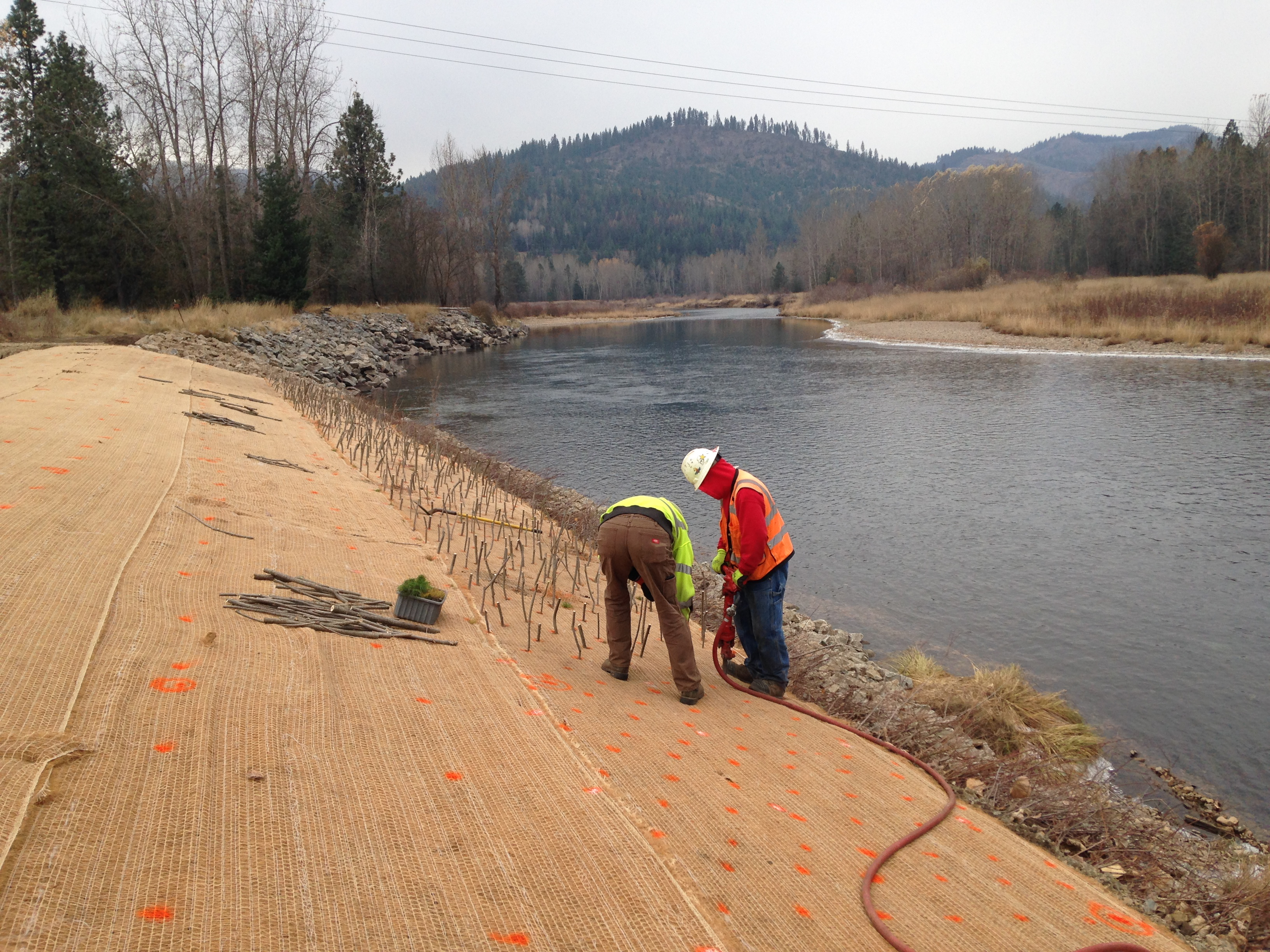 The technique being applied involves stacking layers of soil wrapped in biodegradable fabric with willows planted horizontally in between. The root masses, as they spread and lengthen, will help slow the flow of the river, benefiting fish species in the area as well as lessening the erosion along the approximately 500 feet of bank where the remediation is taking place.